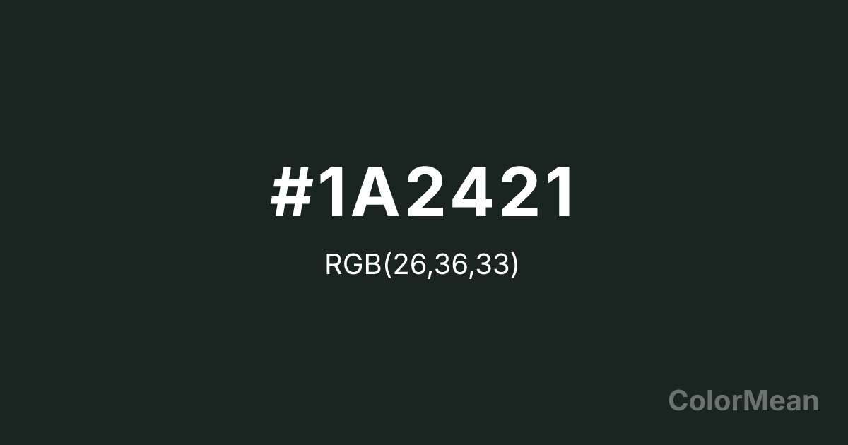 Dark Jungle Green (#1A2421) RGB value is (26, 36, 33). The hex color red value is 26, green is 36, and blue is 33. Its HSL format shows a hue of 162°, saturation of 16 percent, and lightness of 12 percent. The CMYK process values are 28 percent, 0 percent, 8 percent, 86 percent.