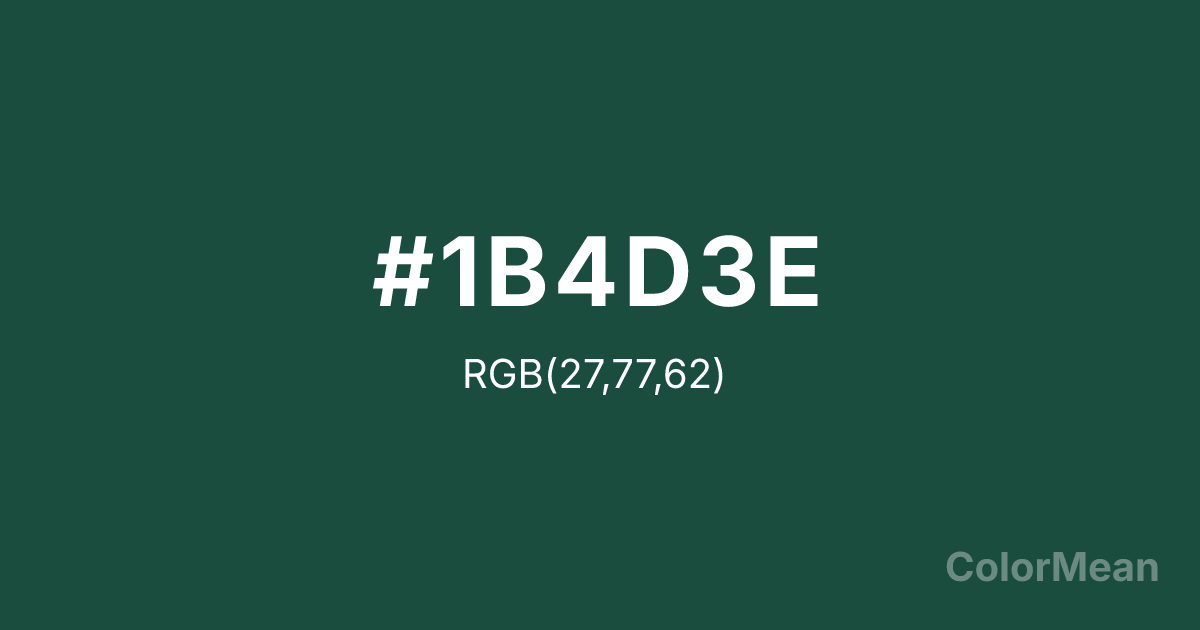English Green (#1B4D3E) RGB value is (27, 77, 62). The hex color red value is 27, green is 77, and blue is 62. Its HSL format shows a hue of 162°, saturation of 48 percent, and lightness of 20 percent. The CMYK process values are 65 percent, 0 percent, 19 percent, 70 percent.