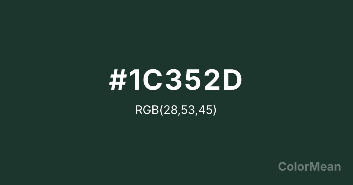 Medium Jungle Green (#1C352D) RGB value is (28, 53, 45). The hex color red value is 28, green is 53, and blue is 45. Its HSL format shows a hue of 161°, saturation of 31 percent, and lightness of 16 percent. The CMYK process values are 47 percent, 0 percent, 15 percent, 79 percent.