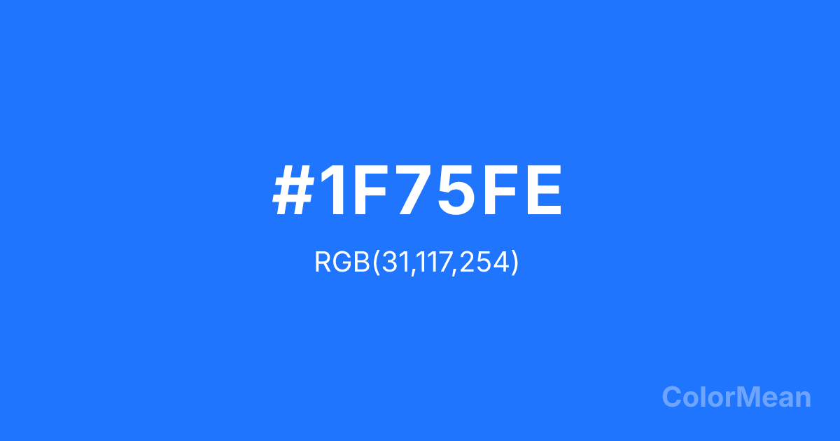 Blue (Crayola) (#1F75FE) RGB value is (31, 117, 254). The hex color red value is 31, green is 117, and blue is 254. Its HSL format shows a hue of 217°, saturation of 99 percent, and lightness of 56 percent. The CMYK process values are 88 percent, 54 percent, 0 percent, 0 percent.