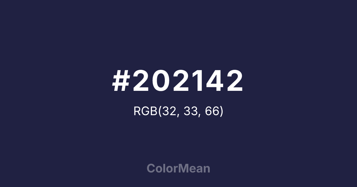 #202142 RGB value is (32, 33, 66). The hex color red value is 32, green is 33, and blue is 66. Its HSL format shows a hue of 238°, saturation of 35 percent, and lightness of 19 percent. The CMYK process values are 52 percent, 50 percent, 0 percent, 74 percent.