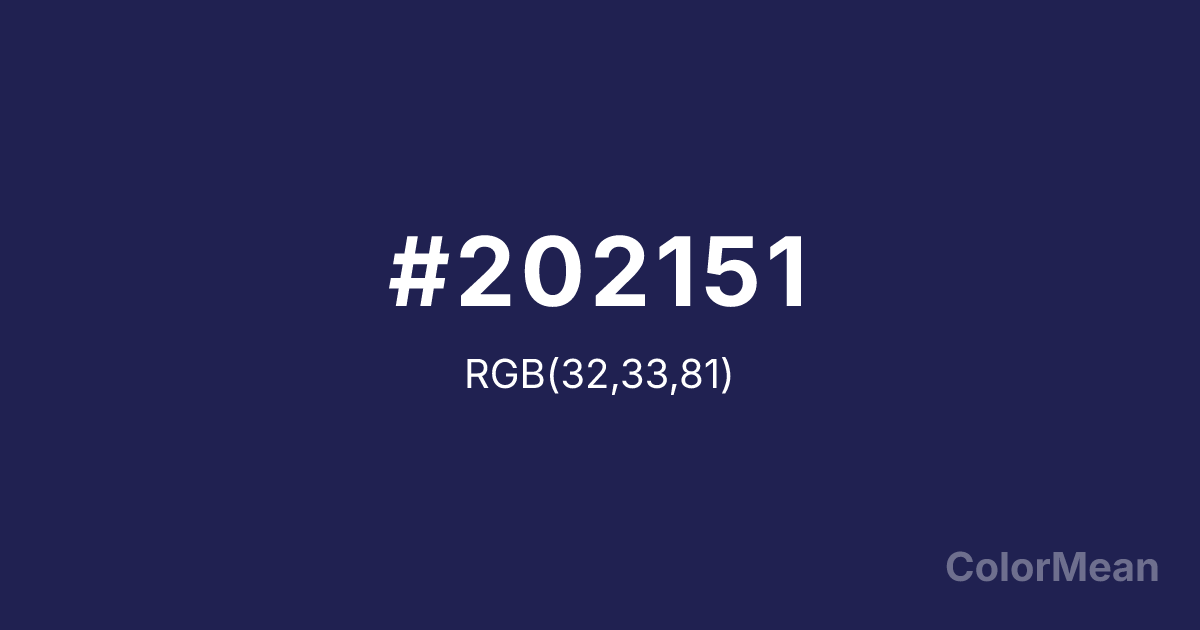 #202151 RGB value is (32, 33, 81). The hex color red value is 32, green is 33, and blue is 81. Its HSL format shows a hue of 239°, saturation of 43 percent, and lightness of 22 percent. The CMYK process values are 60 percent, 59 percent, 0 percent, 68 percent.
