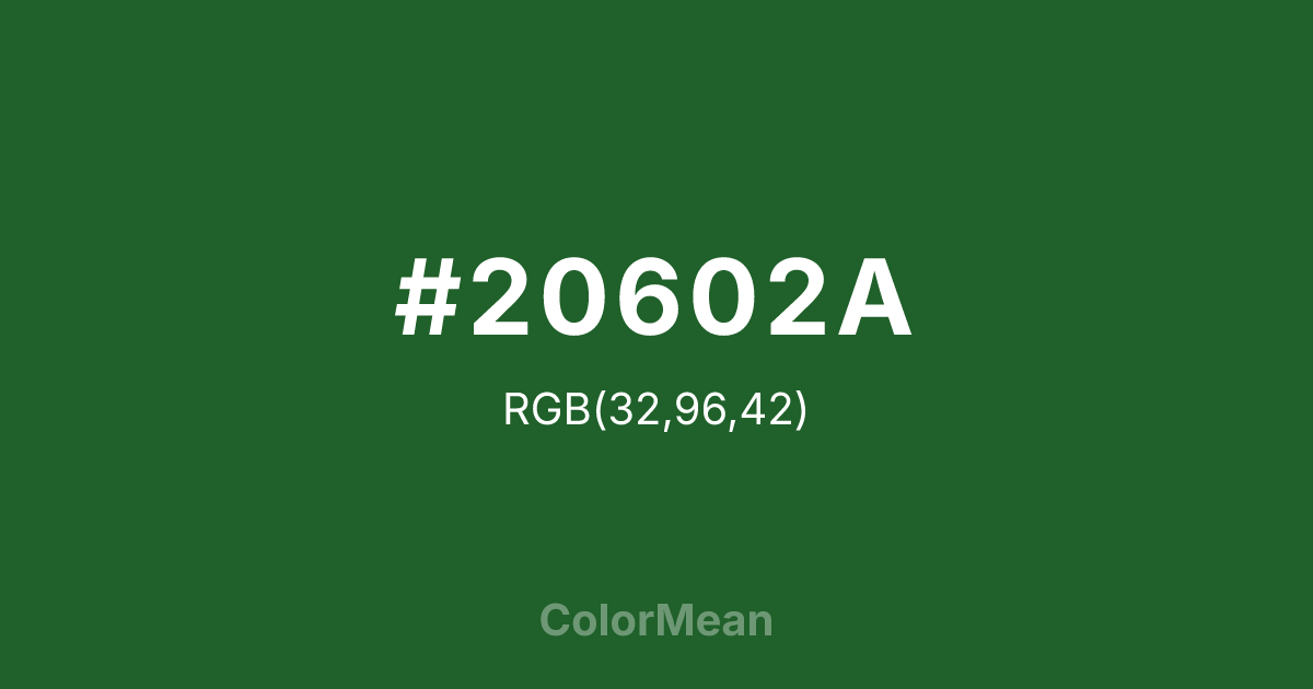 #20602A RGB value is (32, 96, 42). The hex color red value is 32, green is 96, and blue is 42. Its HSL format shows a hue of 129°, saturation of 50 percent, and lightness of 25 percent. The CMYK process values are 67 percent, 0 percent, 56 percent, 62 percent.