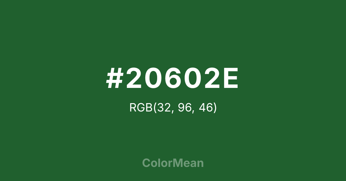 #20602E RGB value is (32, 96, 46). The hex color red value is 32, green is 96, and blue is 46. Its HSL format shows a hue of 133°, saturation of 50 percent, and lightness of 25 percent. The CMYK process values are 67 percent, 0 percent, 52 percent, 62 percent.