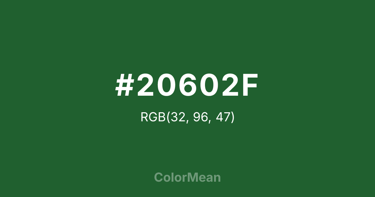 #20602F RGB value is (32, 96, 47). The hex color red value is 32, green is 96, and blue is 47. Its HSL format shows a hue of 134°, saturation of 50 percent, and lightness of 25 percent. The CMYK process values are 67 percent, 0 percent, 51 percent, 62 percent.
