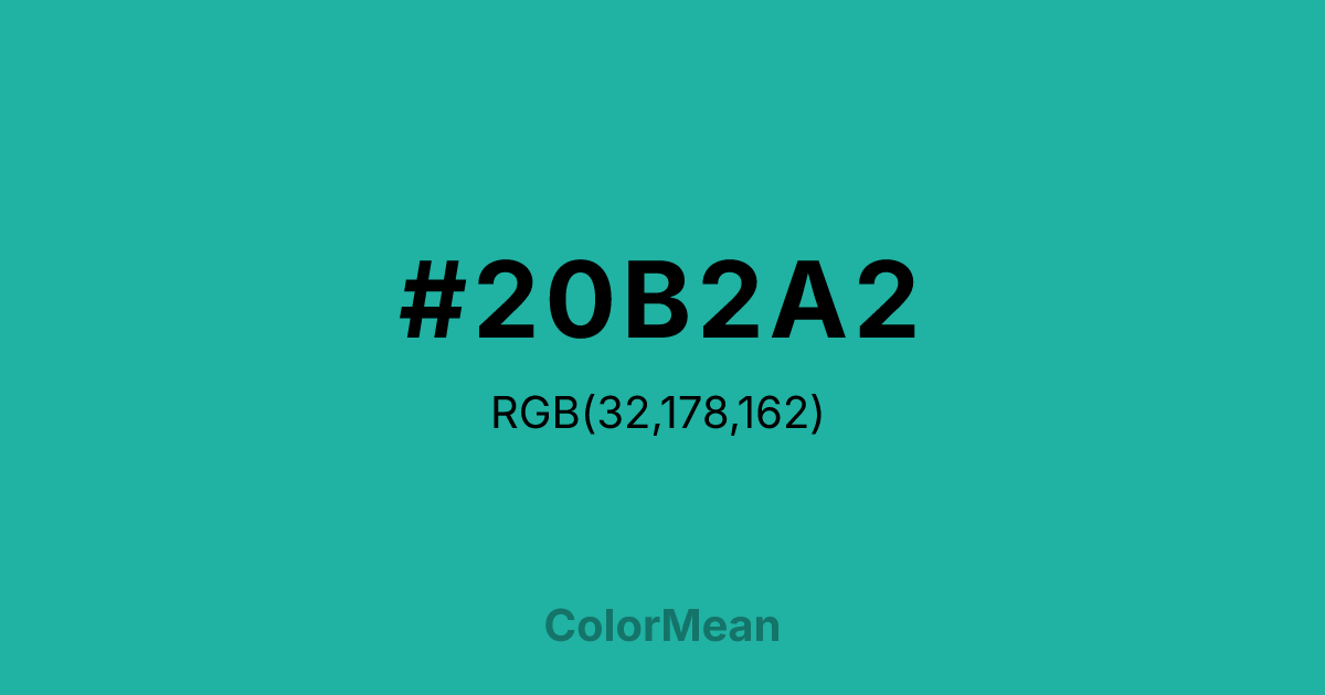 #20B2A2 RGB value is (32, 178, 162). The hex color red value is 32, green is 178, and blue is 162. Its HSL format shows a hue of 173°, saturation of 70 percent, and lightness of 41 percent. The CMYK process values are 82 percent, 0 percent, 9 percent, 30 percent.