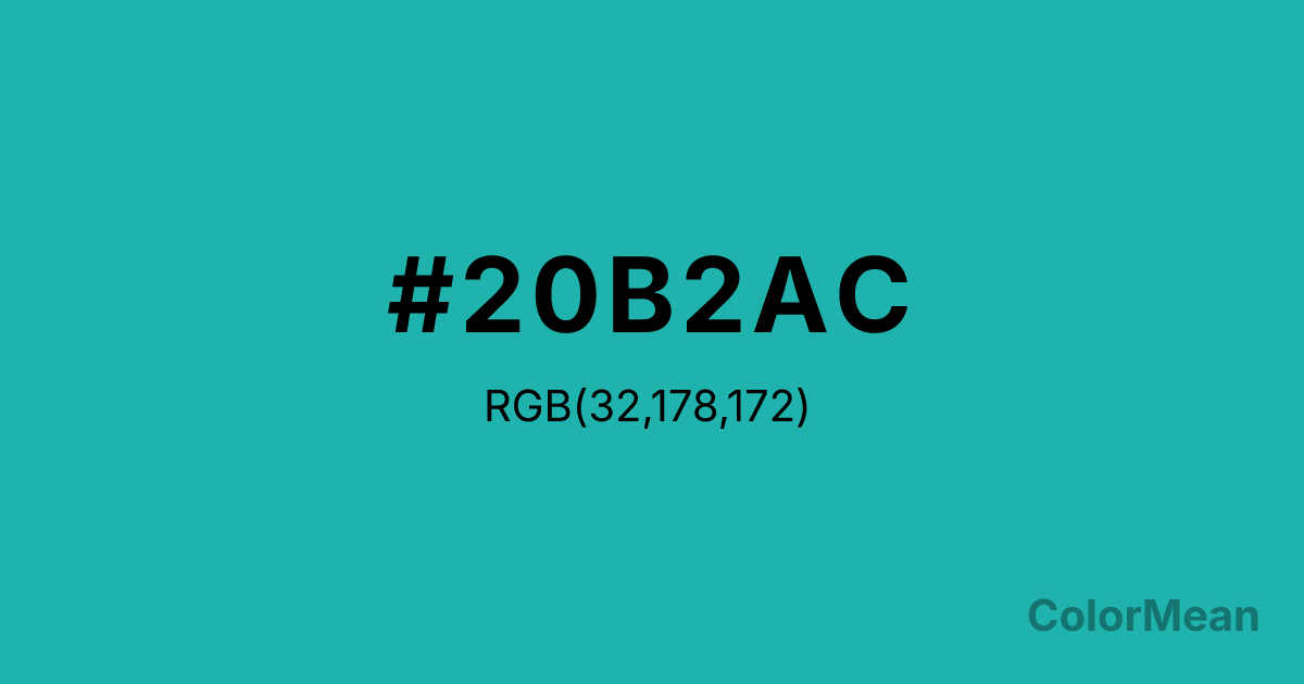 #20B2AC RGB value is (32, 178, 172). The hex color red value is 32, green is 178, and blue is 172. Its HSL format shows a hue of 178°, saturation of 70 percent, and lightness of 41 percent. The CMYK process values are 82 percent, 0 percent, 3 percent, 30 percent.