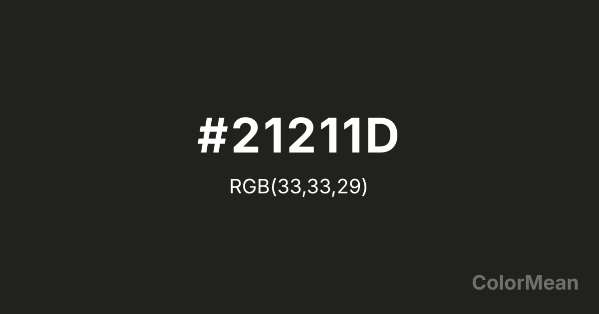 #21211D RGB value is (33, 33, 29). The hex color red value is 33, green is 33, and blue is 29. Its HSL format shows a hue of 60°, saturation of 6 percent, and lightness of 12 percent. The CMYK process values are 0 percent, 0 percent, 12 percent, 87 percent.
