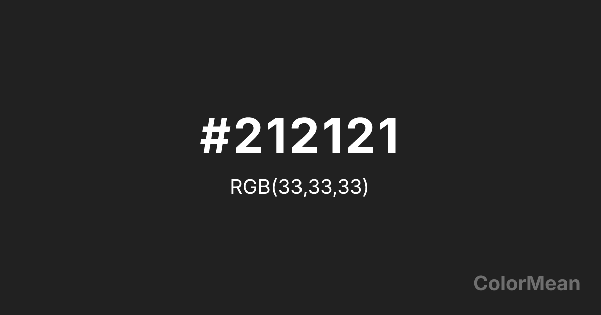 Black Brown (#212121) RGB value is (33, 33, 33). The hex color red value is 33, green is 33, and blue is 33. Its HSL format shows a hue of 0°, saturation of 0 percent, and lightness of 13 percent. The CMYK process values are 0 percent, 0 percent, 0 percent, 87 percent.