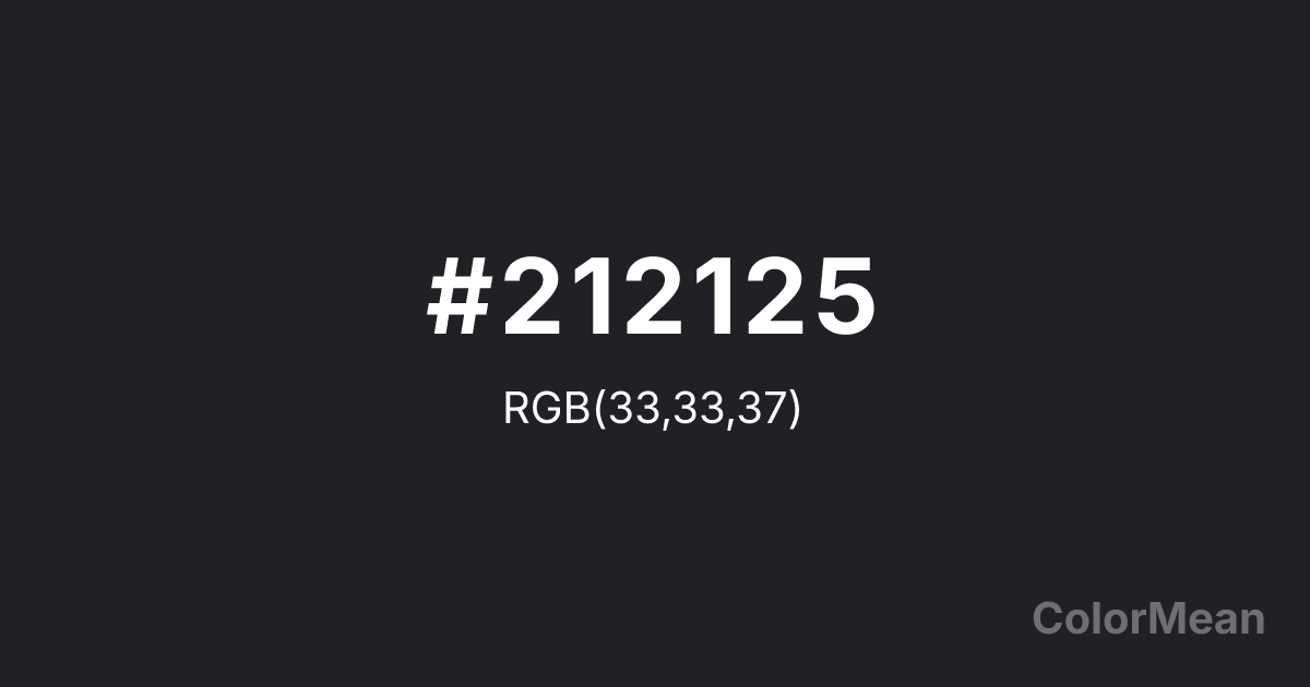 #212125 RGB value is (33, 33, 37). The hex color red value is 33, green is 33, and blue is 37. Its HSL format shows a hue of 240°, saturation of 6 percent, and lightness of 14 percent. The CMYK process values are 11 percent, 11 percent, 0 percent, 85 percent.