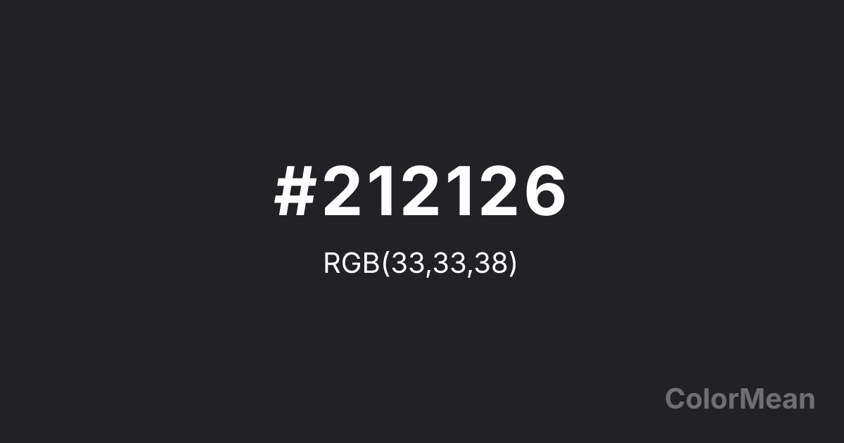 #212126 RGB value is (33, 33, 38). The hex color red value is 33, green is 33, and blue is 38. Its HSL format shows a hue of 240°, saturation of 7 percent, and lightness of 14 percent. The CMYK process values are 13 percent, 13 percent, 0 percent, 85 percent.
