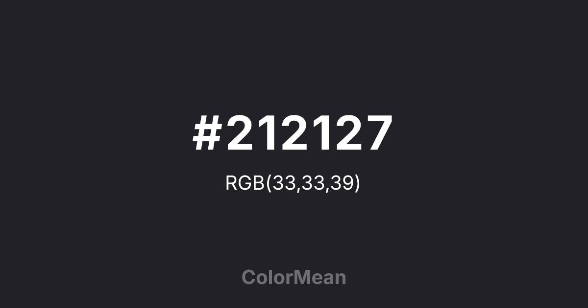 #212127 RGB value is (33, 33, 39). The hex color red value is 33, green is 33, and blue is 39. Its HSL format shows a hue of 240°, saturation of 8 percent, and lightness of 14 percent. The CMYK process values are 15 percent, 15 percent, 0 percent, 85 percent.