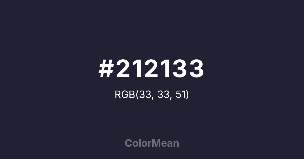 #212133 RGB value is (33, 33, 51). The hex color red value is 33, green is 33, and blue is 51. Its HSL format shows a hue of 240°, saturation of 21 percent, and lightness of 16 percent. The CMYK process values are 35 percent, 35 percent, 0 percent, 80 percent.