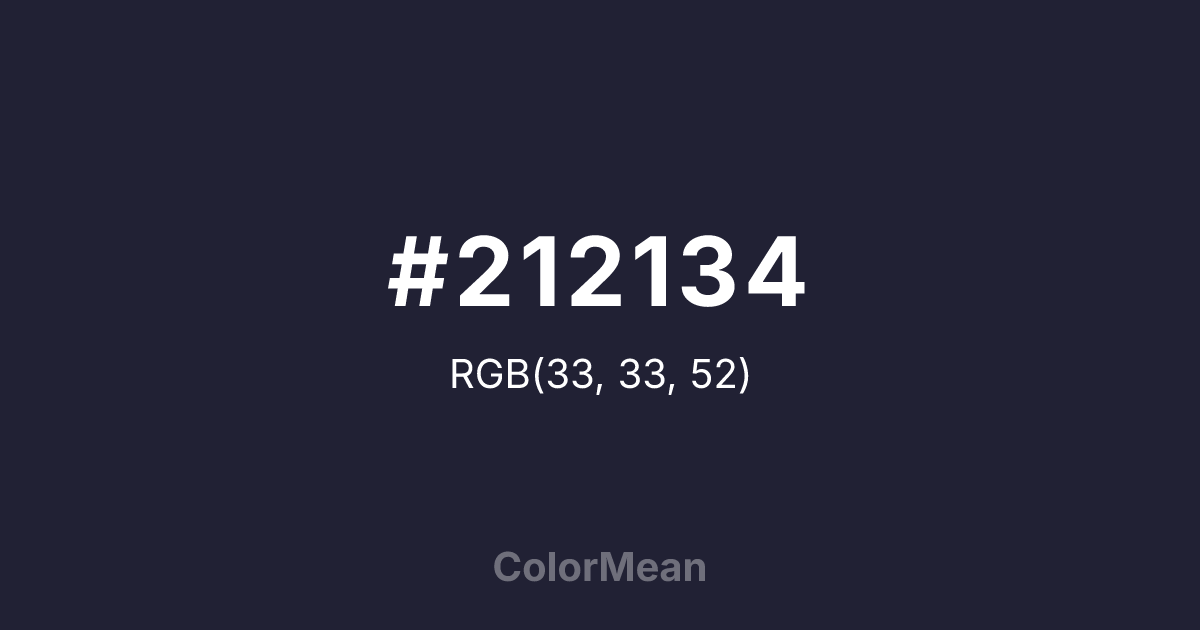 #212134 RGB value is (33, 33, 52). The hex color red value is 33, green is 33, and blue is 52. Its HSL format shows a hue of 240°, saturation of 22 percent, and lightness of 17 percent. The CMYK process values are 37 percent, 37 percent, 0 percent, 80 percent.