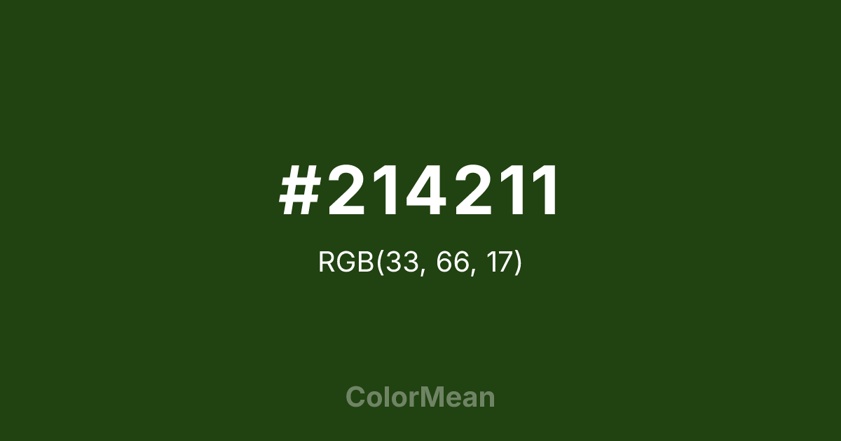 #214211 RGB value is (33, 66, 17). The hex color red value is 33, green is 66, and blue is 17. Its HSL format shows a hue of 100°, saturation of 59 percent, and lightness of 16 percent. The CMYK process values are 50 percent, 0 percent, 74 percent, 74 percent.