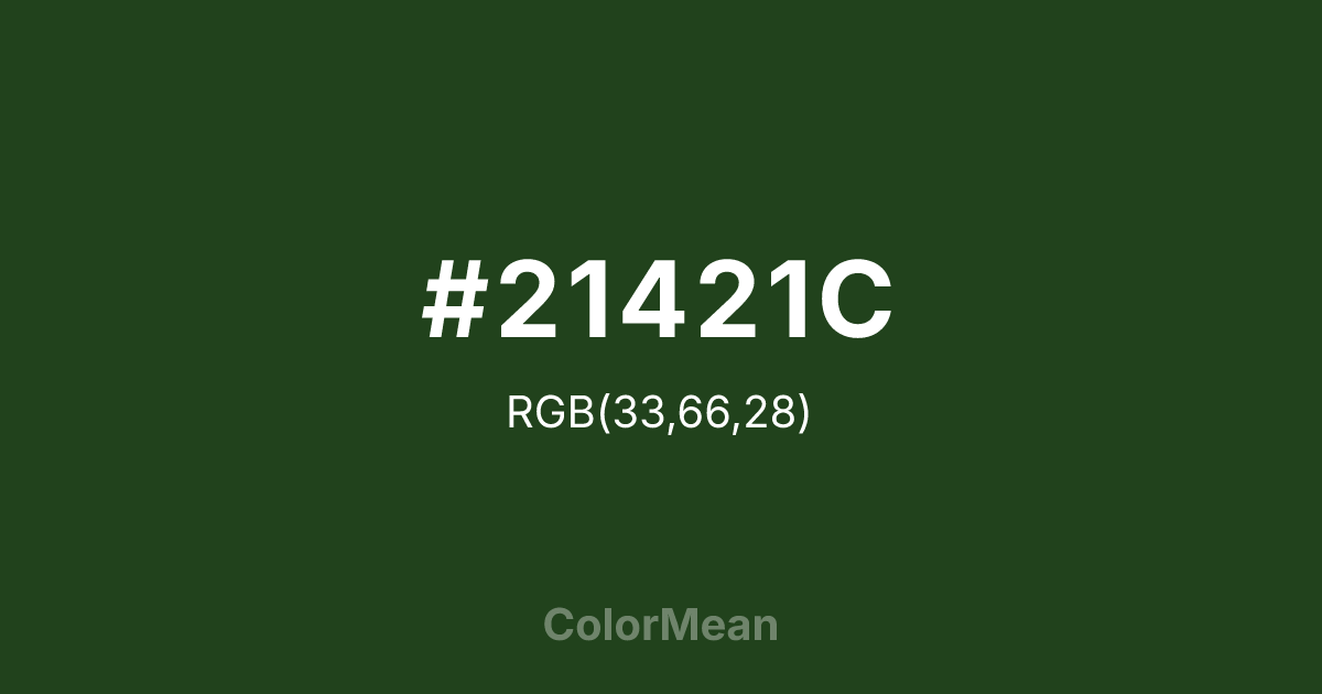 #21421C RGB value is (33, 66, 28). The hex color red value is 33, green is 66, and blue is 28. Its HSL format shows a hue of 112°, saturation of 40 percent, and lightness of 18 percent. The CMYK process values are 50 percent, 0 percent, 58 percent, 74 percent.