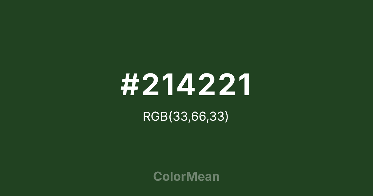 #214221 RGB value is (33, 66, 33). The hex color red value is 33, green is 66, and blue is 33. Its HSL format shows a hue of 120°, saturation of 33 percent, and lightness of 19 percent. The CMYK process values are 50 percent, 0 percent, 50 percent, 74 percent.