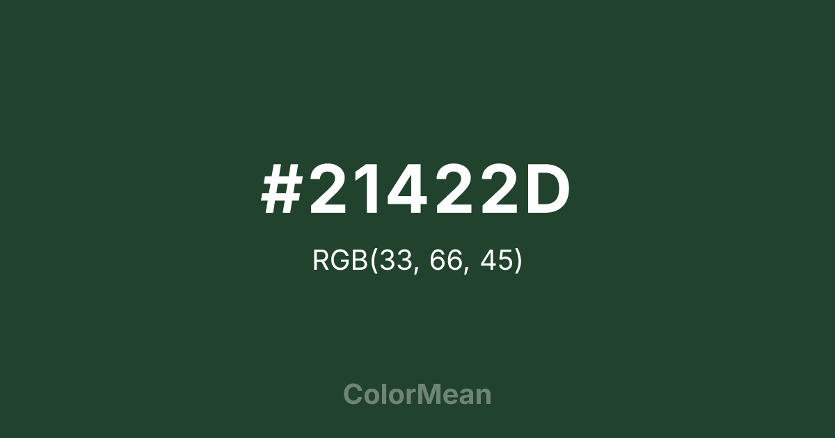 #21422D RGB value is (33, 66, 45). The hex color red value is 33, green is 66, and blue is 45. Its HSL format shows a hue of 142°, saturation of 33 percent, and lightness of 19 percent. The CMYK process values are 50 percent, 0 percent, 32 percent, 74 percent.