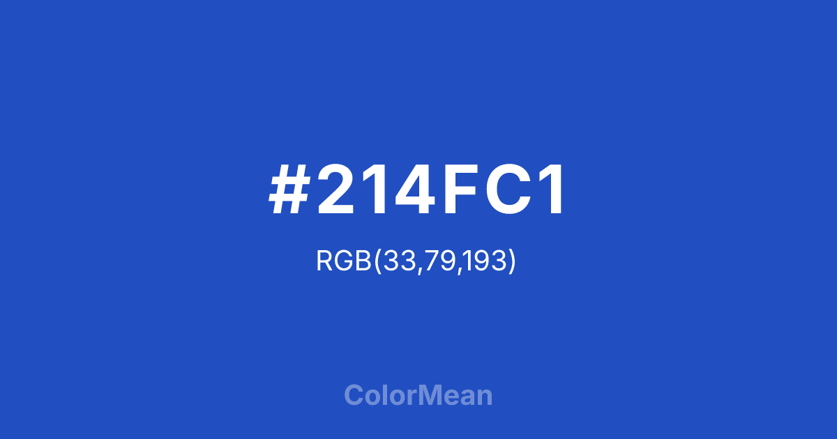 #214FC1 RGB value is (33, 79, 193). The hex color red value is 33, green is 79, and blue is 193. Its HSL format shows a hue of 223°, saturation of 71 percent, and lightness of 44 percent. The CMYK process values are 83 percent, 59 percent, 0 percent, 24 percent.