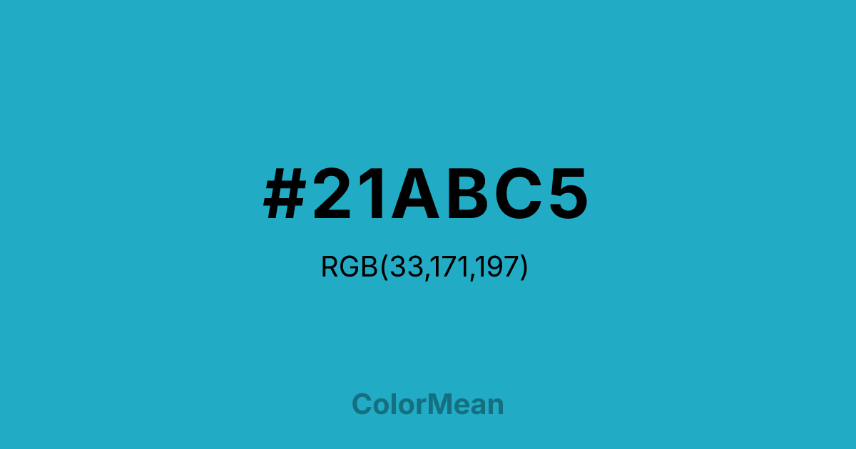 #21ABC5 RGB value is (33, 171, 197). The hex color red value is 33, green is 171, and blue is 197. Its HSL format shows a hue of 190°, saturation of 71 percent, and lightness of 45 percent. The CMYK process values are 83 percent, 13 percent, 0 percent, 23 percent.