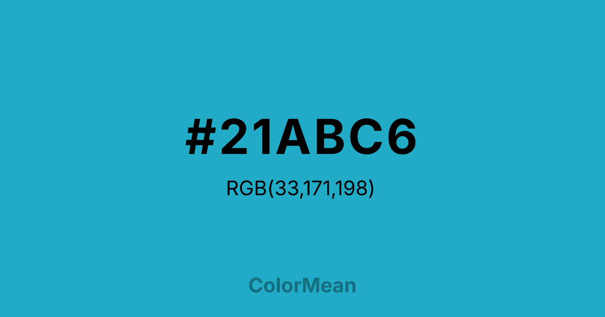 #21ABC6 RGB value is (33, 171, 198). The hex color red value is 33, green is 171, and blue is 198. Its HSL format shows a hue of 190°, saturation of 71 percent, and lightness of 45 percent. The CMYK process values are 83 percent, 14 percent, 0 percent, 22 percent.