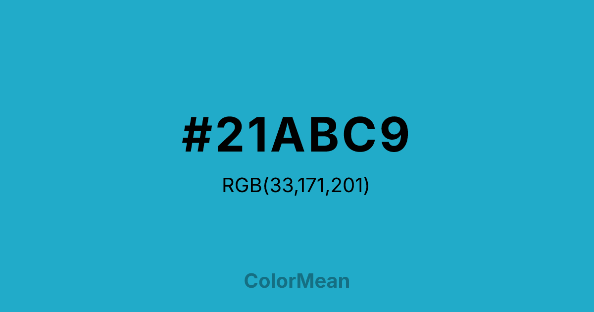 #21ABC9 RGB value is (33, 171, 201). The hex color red value is 33, green is 171, and blue is 201. Its HSL format shows a hue of 191°, saturation of 72 percent, and lightness of 46 percent. The CMYK process values are 84 percent, 15 percent, 0 percent, 21 percent.
