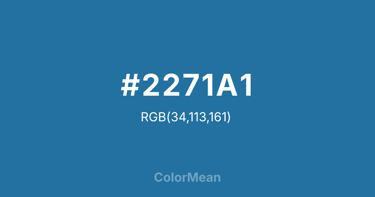 #2271A1 RGB value is (34, 113, 161). The hex color red value is 34, green is 113, and blue is 161. Its HSL format shows a hue of 203°, saturation of 65 percent, and lightness of 38 percent. The CMYK process values are 79 percent, 30 percent, 0 percent, 37 percent.