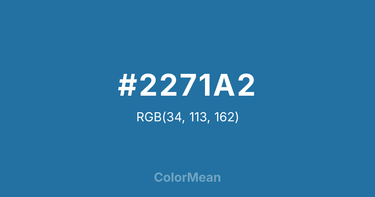 #2271A2 RGB value is (34, 113, 162). The hex color red value is 34, green is 113, and blue is 162. Its HSL format shows a hue of 203°, saturation of 65 percent, and lightness of 38 percent. The CMYK process values are 79 percent, 30 percent, 0 percent, 36 percent.