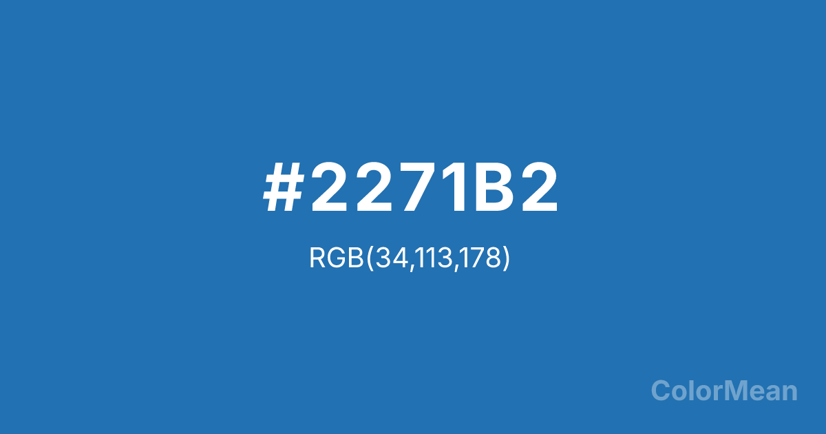 #2271B2 RGB value is (34, 113, 178). The hex color red value is 34, green is 113, and blue is 178. Its HSL format shows a hue of 207°, saturation of 68 percent, and lightness of 42 percent. The CMYK process values are 81 percent, 37 percent, 0 percent, 30 percent.