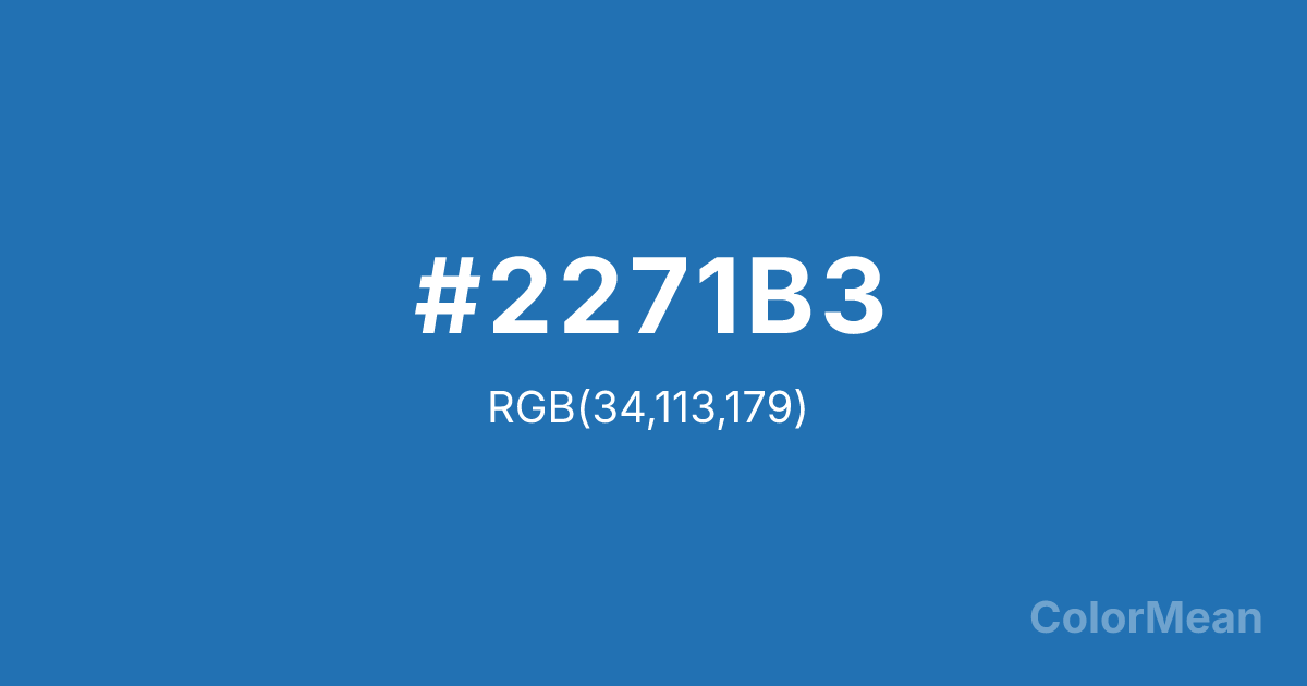 Sky Blue (#2271B3) RGB value is (34, 113, 179). The hex color red value is 34, green is 113, and blue is 179. Its HSL format shows a hue of 207°, saturation of 68 percent, and lightness of 42 percent. The CMYK process values are 81 percent, 37 percent, 0 percent, 30 percent.
