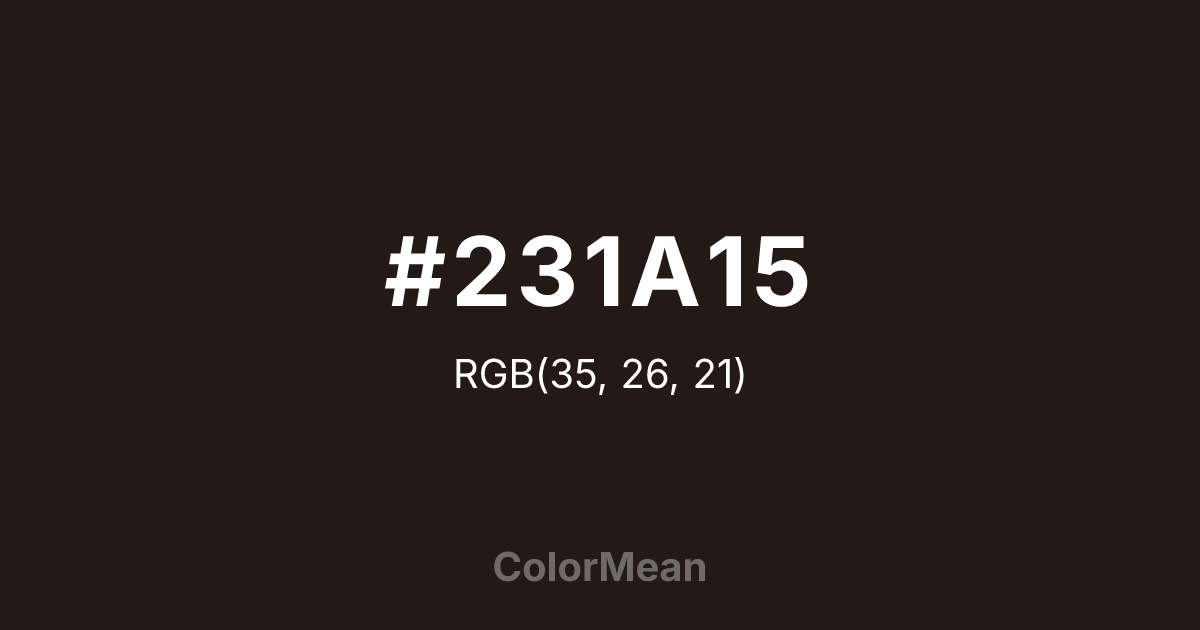 #231A15 RGB value is (35, 26, 21). The hex color red value is 35, green is 26, and blue is 21. Its HSL format shows a hue of 21°, saturation of 25 percent, and lightness of 11 percent. The CMYK process values are 0 percent, 26 percent, 40 percent, 86 percent.