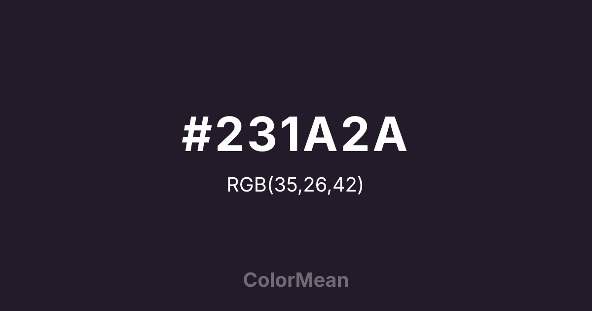 #231A2A RGB value is (35, 26, 42). The hex color red value is 35, green is 26, and blue is 42. Its HSL format shows a hue of 274°, saturation of 24 percent, and lightness of 13 percent. The CMYK process values are 17 percent, 38 percent, 0 percent, 84 percent.