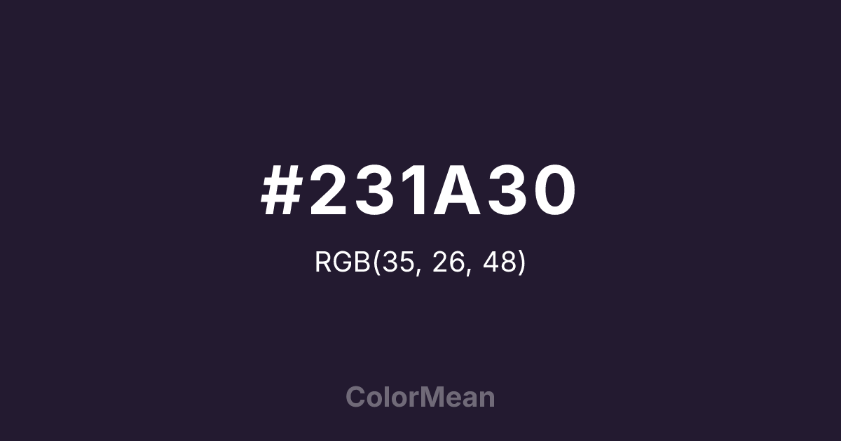 #231A30 RGB value is (35, 26, 48). The hex color red value is 35, green is 26, and blue is 48. Its HSL format shows a hue of 265°, saturation of 30 percent, and lightness of 15 percent. The CMYK process values are 27 percent, 46 percent, 0 percent, 81 percent.