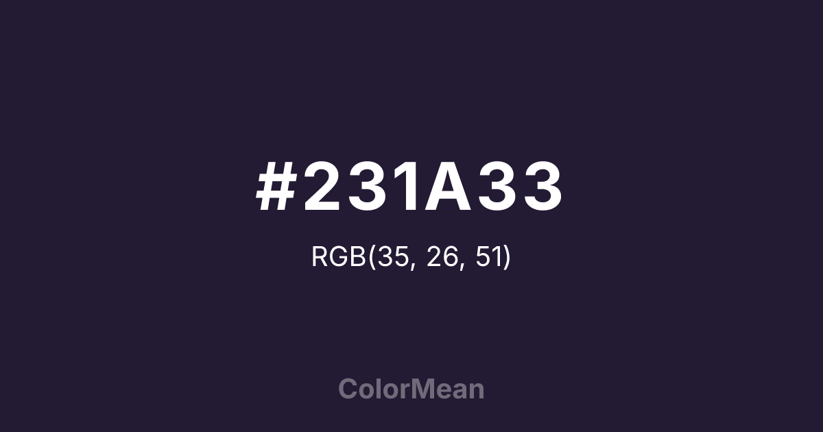 #231A33 RGB value is (35, 26, 51). The hex color red value is 35, green is 26, and blue is 51. Its HSL format shows a hue of 262°, saturation of 32 percent, and lightness of 15 percent. The CMYK process values are 31 percent, 49 percent, 0 percent, 80 percent.