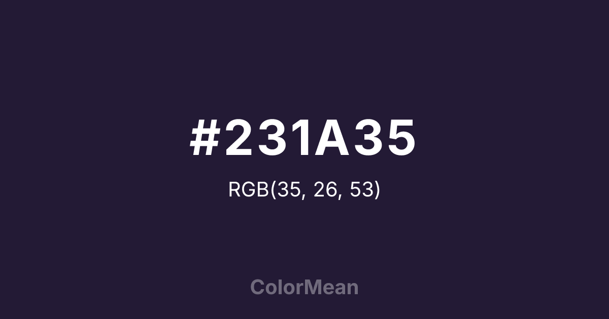 #231A35 RGB value is (35, 26, 53). The hex color red value is 35, green is 26, and blue is 53. Its HSL format shows a hue of 260°, saturation of 34 percent, and lightness of 15 percent. The CMYK process values are 34 percent, 51 percent, 0 percent, 79 percent.