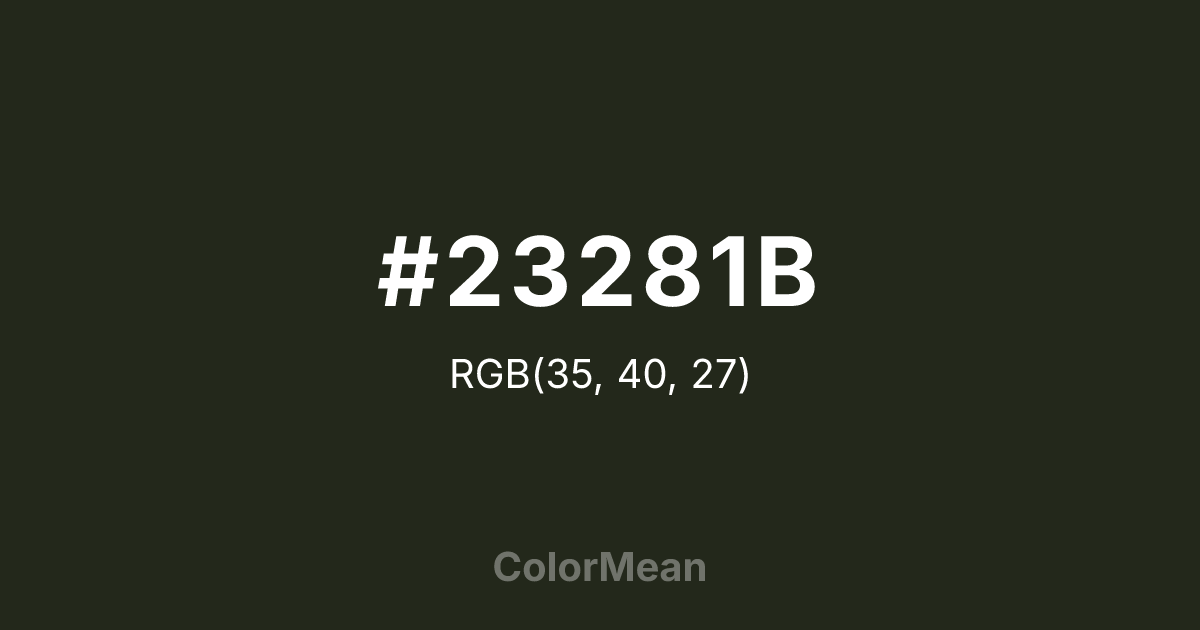 #23281B RGB value is (35, 40, 27). The hex color red value is 35, green is 40, and blue is 27. Its HSL format shows a hue of 83°, saturation of 19 percent, and lightness of 13 percent. The CMYK process values are 13 percent, 0 percent, 33 percent, 84 percent.