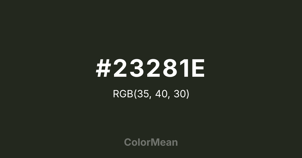 #23281E RGB value is (35, 40, 30). The hex color red value is 35, green is 40, and blue is 30. Its HSL format shows a hue of 90°, saturation of 14 percent, and lightness of 14 percent. The CMYK process values are 13 percent, 0 percent, 25 percent, 84 percent.