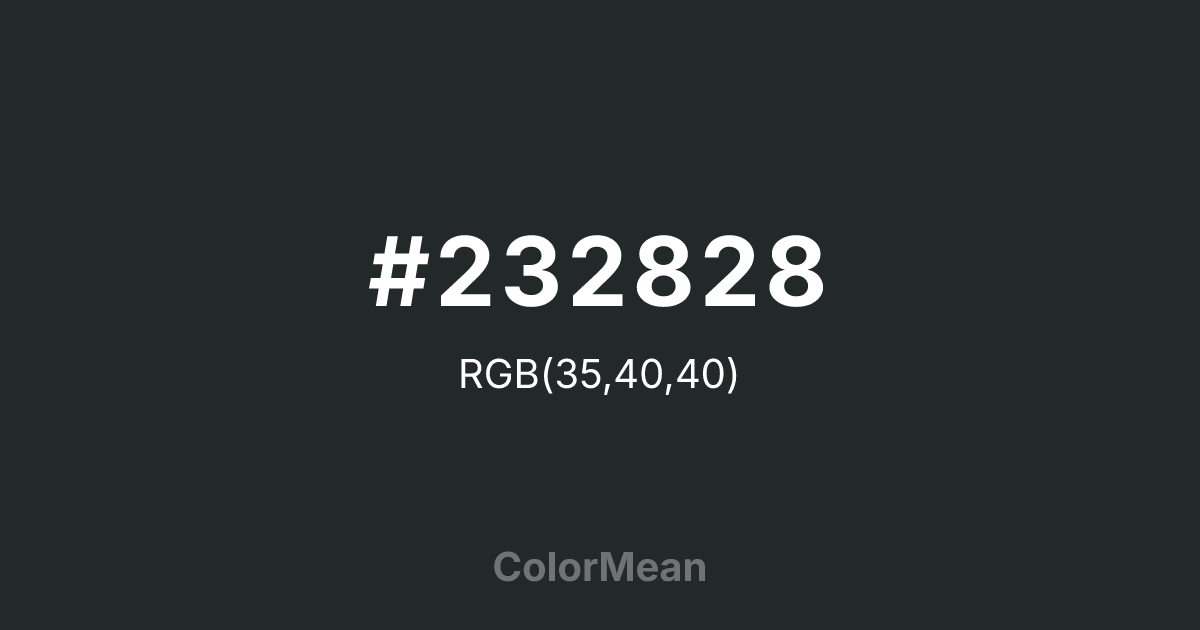 #232828 RGB value is (35, 40, 40). The hex color red value is 35, green is 40, and blue is 40. Its HSL format shows a hue of 180°, saturation of 7 percent, and lightness of 15 percent. The CMYK process values are 13 percent, 0 percent, 0 percent, 84 percent.
