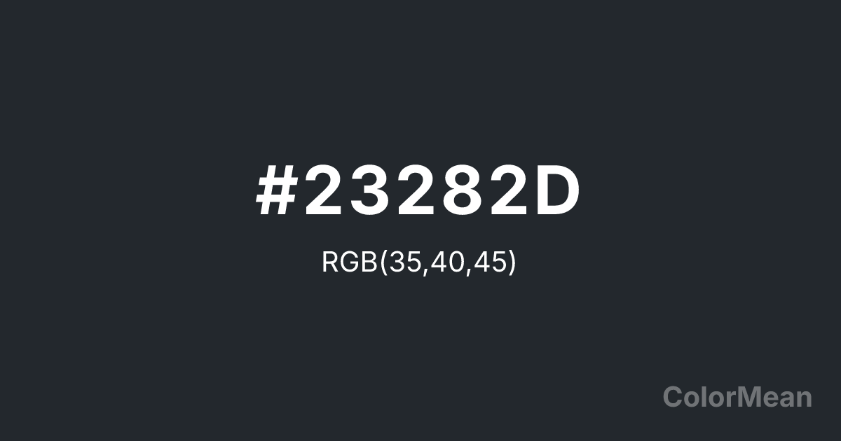 #23282D RGB value is (35, 40, 45). The hex color red value is 35, green is 40, and blue is 45. Its HSL format shows a hue of 210°, saturation of 13 percent, and lightness of 16 percent. The CMYK process values are 22 percent, 11 percent, 0 percent, 82 percent.