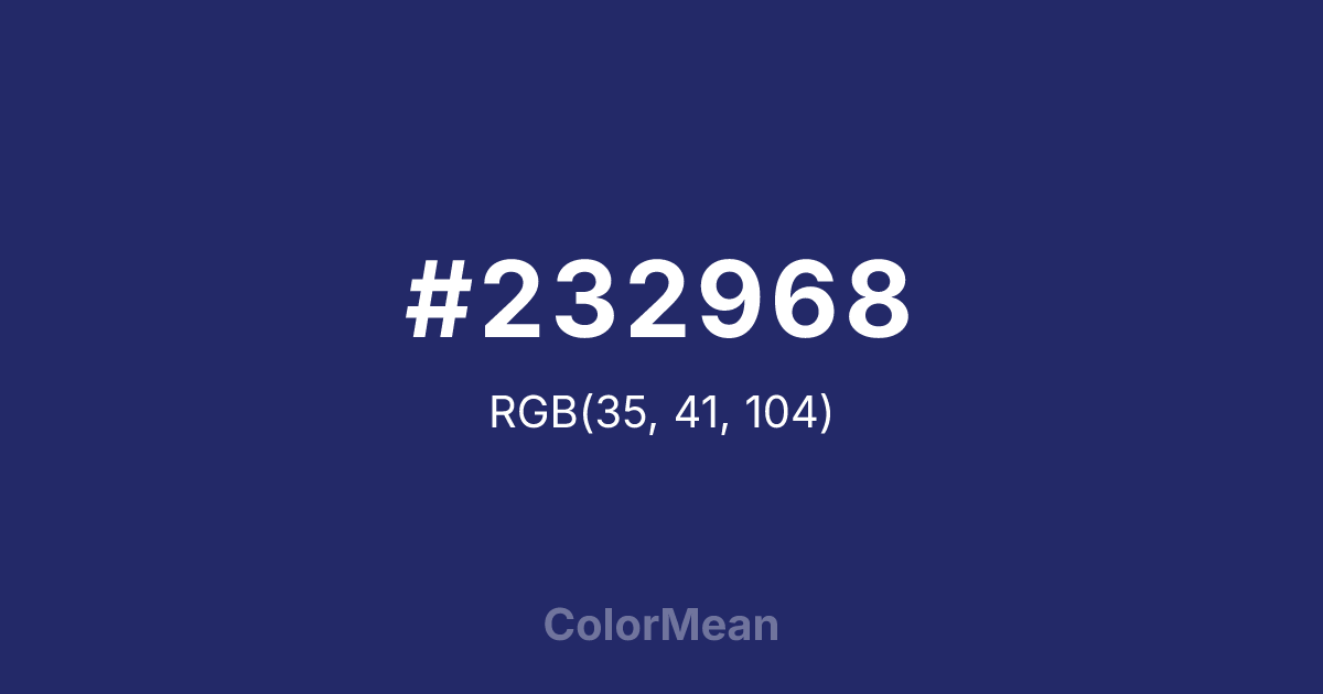 #232968 RGB value is (35, 41, 104). The hex color red value is 35, green is 41, and blue is 104. Its HSL format shows a hue of 235°, saturation of 50 percent, and lightness of 27 percent. The CMYK process values are 66 percent, 61 percent, 0 percent, 59 percent.