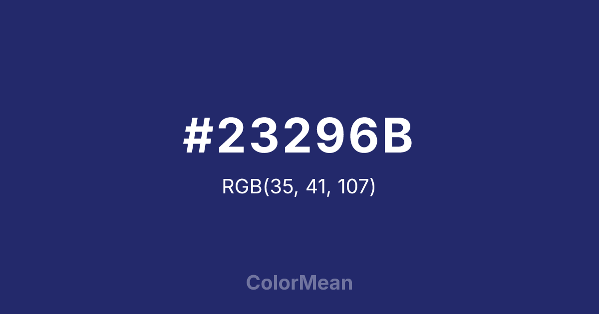 #23296B RGB value is (35, 41, 107). The hex color red value is 35, green is 41, and blue is 107. Its HSL format shows a hue of 235°, saturation of 51 percent, and lightness of 28 percent. The CMYK process values are 67 percent, 62 percent, 0 percent, 58 percent.
