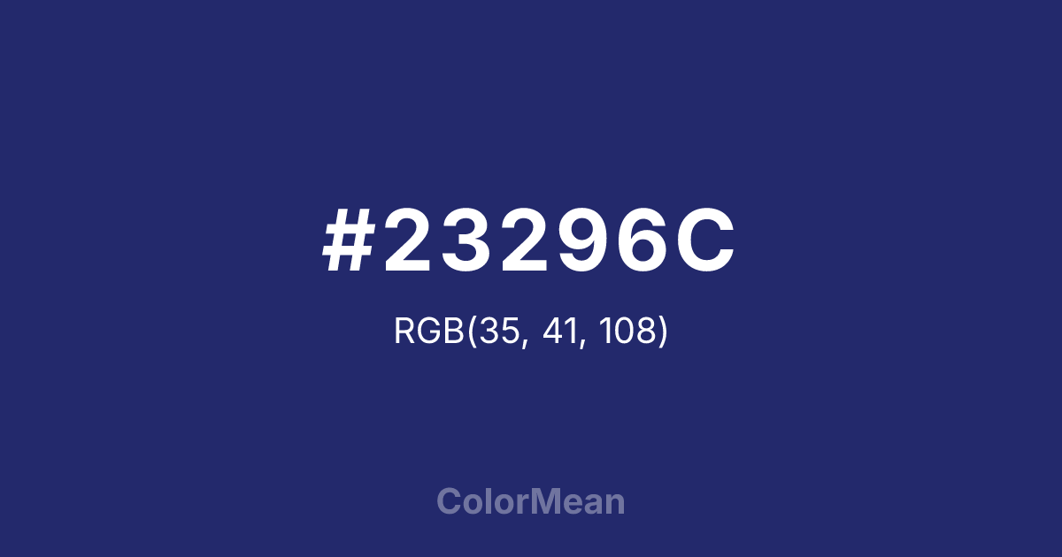 #23296C RGB value is (35, 41, 108). The hex color red value is 35, green is 41, and blue is 108. Its HSL format shows a hue of 235°, saturation of 51 percent, and lightness of 28 percent. The CMYK process values are 68 percent, 62 percent, 0 percent, 58 percent.