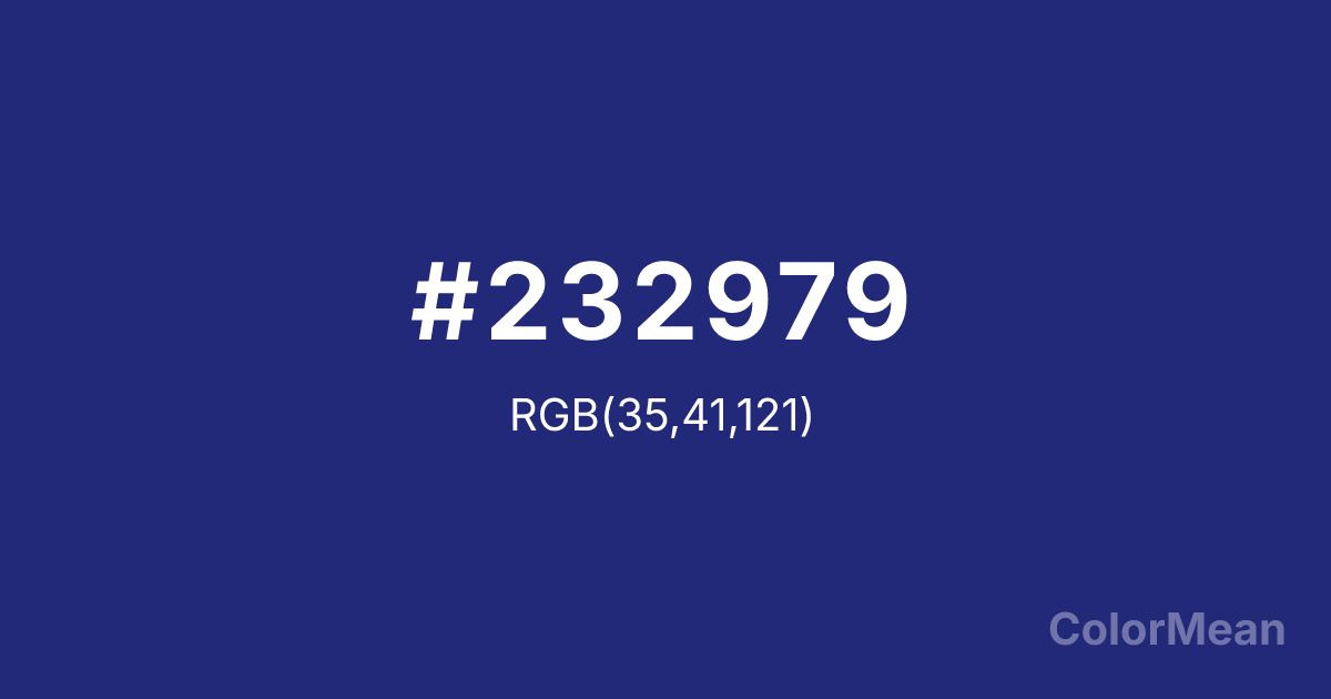 #232979 RGB value is (35, 41, 121). The hex color red value is 35, green is 41, and blue is 121. Its HSL format shows a hue of 236°, saturation of 55 percent, and lightness of 31 percent. The CMYK process values are 71 percent, 66 percent, 0 percent, 53 percent.