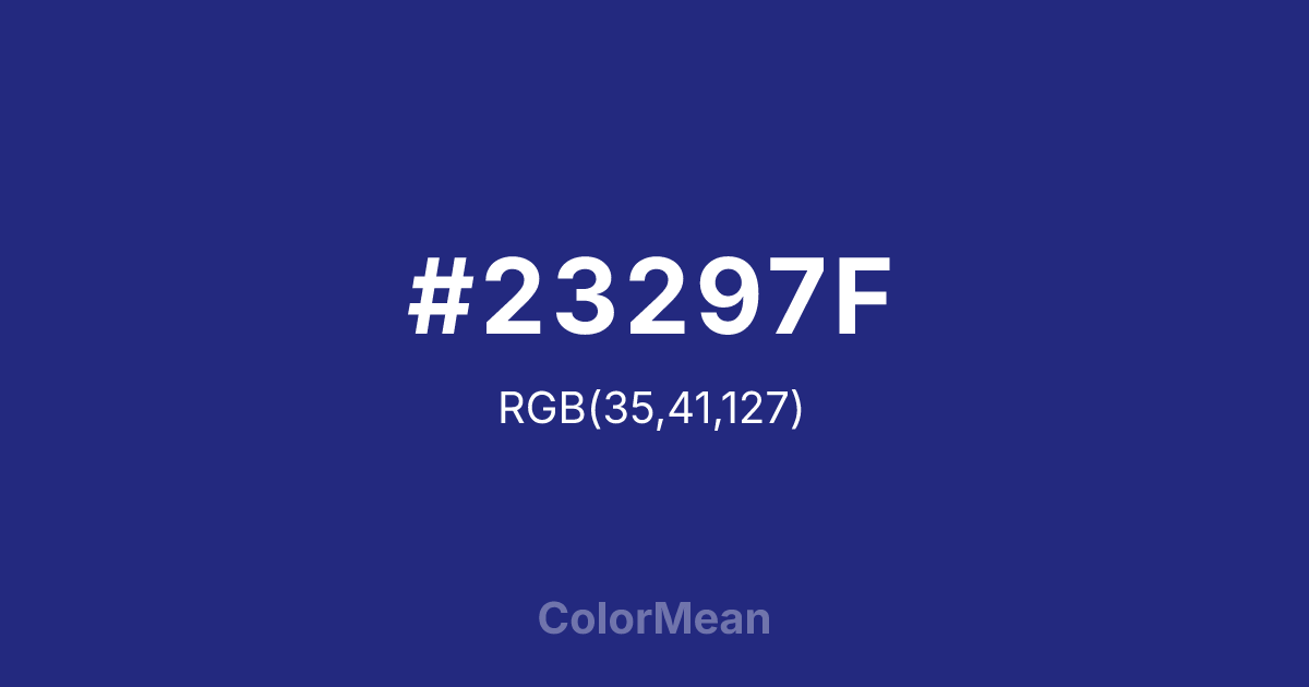 #23297F RGB value is (35, 41, 127). The hex color red value is 35, green is 41, and blue is 127. Its HSL format shows a hue of 236°, saturation of 57 percent, and lightness of 32 percent. The CMYK process values are 72 percent, 68 percent, 0 percent, 50 percent.