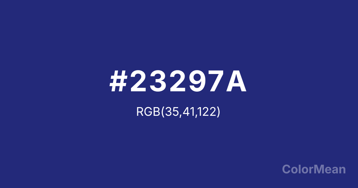 St. Patricks Blue (#23297A) RGB value is (35, 41, 122). The hex color red value is 35, green is 41, and blue is 122. Its HSL format shows a hue of 236°, saturation of 55 percent, and lightness of 31 percent. The CMYK process values are 71 percent, 66 percent, 0 percent, 52 percent.