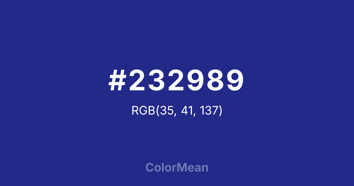 #232989 RGB value is (35, 41, 137). The hex color red value is 35, green is 41, and blue is 137. Its HSL format shows a hue of 236°, saturation of 59 percent, and lightness of 34 percent. The CMYK process values are 74 percent, 70 percent, 0 percent, 46 percent.