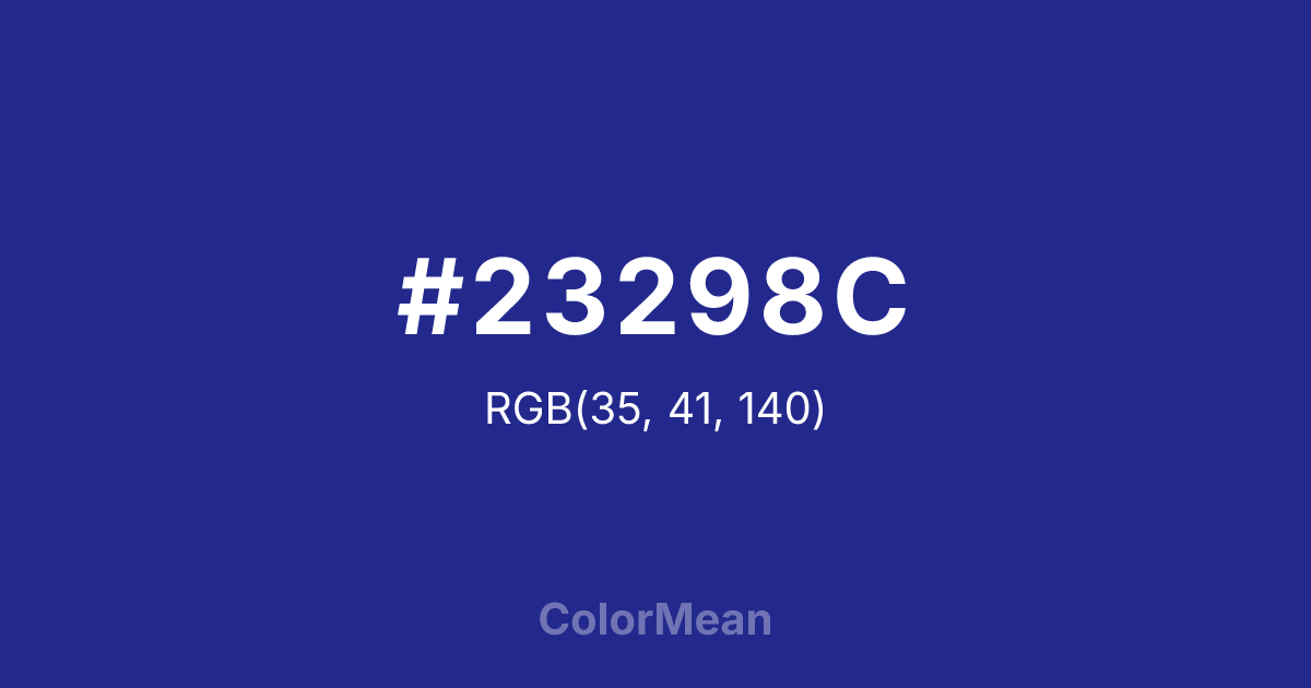 #23298C RGB value is (35, 41, 140). The hex color red value is 35, green is 41, and blue is 140. Its HSL format shows a hue of 237°, saturation of 60 percent, and lightness of 34 percent. The CMYK process values are 75 percent, 71 percent, 0 percent, 45 percent.