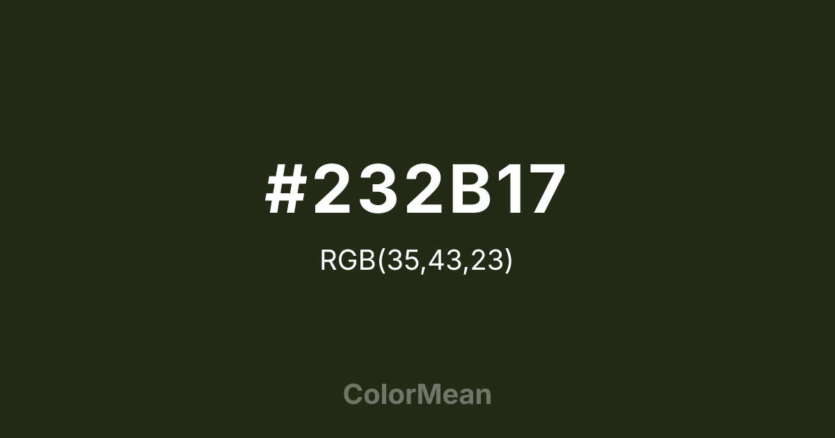 #232B17 RGB value is (35, 43, 23). The hex color red value is 35, green is 43, and blue is 23. Its HSL format shows a hue of 84°, saturation of 30 percent, and lightness of 13 percent. The CMYK process values are 19 percent, 0 percent, 47 percent, 83 percent.