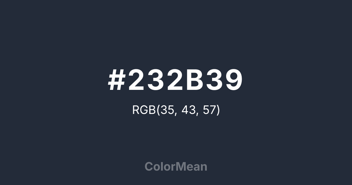 #232B39 RGB value is (35, 43, 57). The hex color red value is 35, green is 43, and blue is 57. Its HSL format shows a hue of 218°, saturation of 24 percent, and lightness of 18 percent. The CMYK process values are 39 percent, 25 percent, 0 percent, 78 percent.