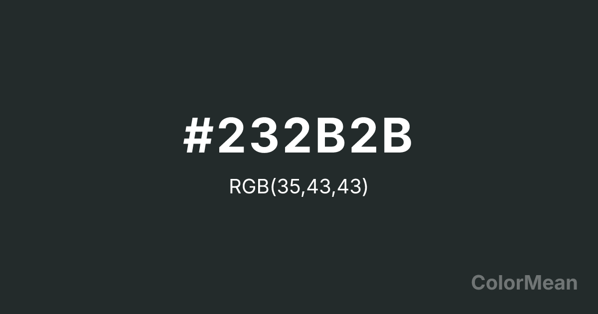 Charleston Green (#232B2B) RGB value is (35, 43, 43). The hex color red value is 35, green is 43, and blue is 43. Its HSL format shows a hue of 180°, saturation of 10 percent, and lightness of 15 percent. The CMYK process values are 19 percent, 0 percent, 0 percent, 83 percent.